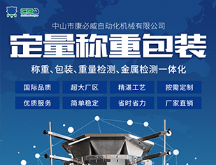 中山市康必威自动化机械有限公司是一家专业从事研发,生产制造,销售,服务于一体的高新技术企业,专注于定量称重包装领域的高科技企业。公司自成立以来,一贯以市场需求为导向,一直致力于向客户提供高速、高精度、高智能的电脑组合秤和定量称重包装系统,以满足客户需求为已任,提供真正意义上的模块化组合秤,尽最大限度的为您减少售后维护成本,实现共赢。 产品应用: 我司研制的产品主要是多头电脑组合秤,线性秤,选别秤,物料输送机,包装机,金检机,平台等,实现了称重,包装,重量检测,金属检测一体化,多头电脑组合秤具有计量准确,快速,自动化程度高等特点,被广泛应用于食品,五金等的定量称重包装,是各种规格的立式包装机和给袋式包装机最理想的配套称重设备,我司更专注于用户方案定制,为您提供更省心专业的项目方案。